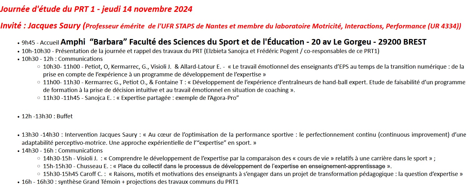 Journée d'étude du PRT1 - 14 novembre 2024Amphi Barbara - FSSE - 20 avenue Le Gorgeu - 29200 Brest Programme